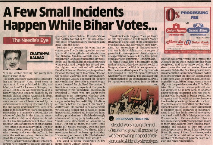 So while things look a bit fraught in the nation’s capital, they look more cheerful in Nagpur, where the RSS is headquartered. But these are all sub-plots. The big drama is being staged in Bihar. Things are often not what they seem in India. The arousal of this or that section of the population could well be ingredients to be tossed into the Bihar election cauldron. Voting for a third of the 243 seats in the state legislature has been completed, and three more polling days stretch over the next two weeks. Turnout was over 55% in the first two phases; women came out in huge numbers to vote. So far, the signs are that the election is going to be a tight race, with the B JP and its allies holding a slim edge. Bihar has grown at a smart clip over the past decade under Chief Minister Nitish Kumar, whose political star has dimmed; he is now seen as another power-seeking politician and not the reformer who brought in better roads, less thuggery, and thought up game-changers like free bicycles for girls to ride to school. That is because Nitish’s first burst of development was not enough: Bihar is impatient to clamber out of centuries of backwardness. It still has high rates of unemployment and is still India’s third-poorest state. Cram schools in Patna and other Bihar cities are bursting with young people, many of them girls, eager to learn English, mathematics and science so they can better their job prospects. Young Biharis between 18 and 29, many of them first-timers, make up 30% of Bihar’s 66 million voters. They want out of the traps of poverty, caste, religion and rancorous politics.