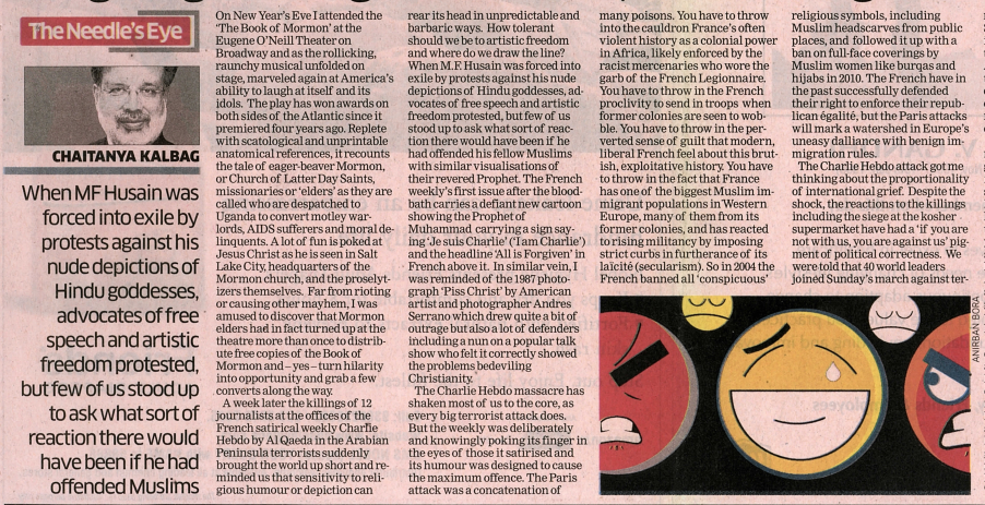 rear its head in unpredictable and barbaric ways. How tolerant should we be to artistic freedom and where do we draw the line? When M.F. Husain was forced into exile by protests his nude depictions of Hindu goddesses, adÂvocates of free speech and artistic freedom protested, but few of us stood up to ask what sort of reacÂtion there would have been if he had offended his fellow Muslims with similar visualizations of their revered Prophet. The French weekly’s first issue after the bloodÂbath carries a defiant new cartoon showing the Prophet of Muhammad carrying a sign sayÂing ‘Je suis Charlie’ (I am Charlie’) and the headline ‘All is Forgiven’ in French above it. In similar vein, I was reminded of the 1987 photoÂgraph ‘Piss Christ’ by American artist and photographer Andres Serrano which drew quite a bit of outrage but also a lot of defenders including a nun on a popular talk show who felt it correctly showed the problems bedeviling Christianity.Â