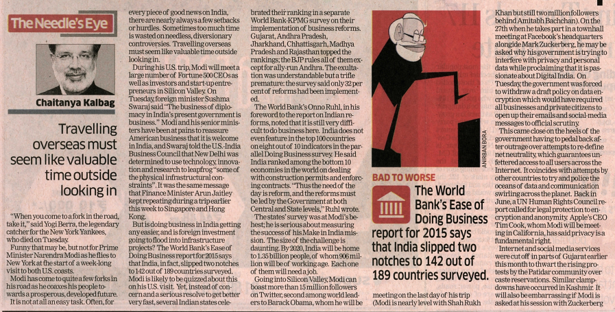But is doing business in India getting any easier, and is foreign investment going to flood into infrastructure projects? The World Bank’s Ease of Doing Business report for 2015 says that India, in fact, slipped two notches to 142 out of 189 countries surveyed. Modi is likely to be quizzed about this on his U.S. visit. Yet, instead of concern and a serious resolve to get better very fast, several Indian states celebrated their ranking in a separate World Bank-KPMG survey on their implementation of business reforms. Gujarat, Andhra Pradesh, Jharkhand, Chhattisgarh, Madhya Pradesh and Rajasthan topped the rankings; the BJP rules all of them except for ally-run Andhra. The exultation was understandable but a trifle premature: the survey said only 32 per cent of reforms had been implemented.