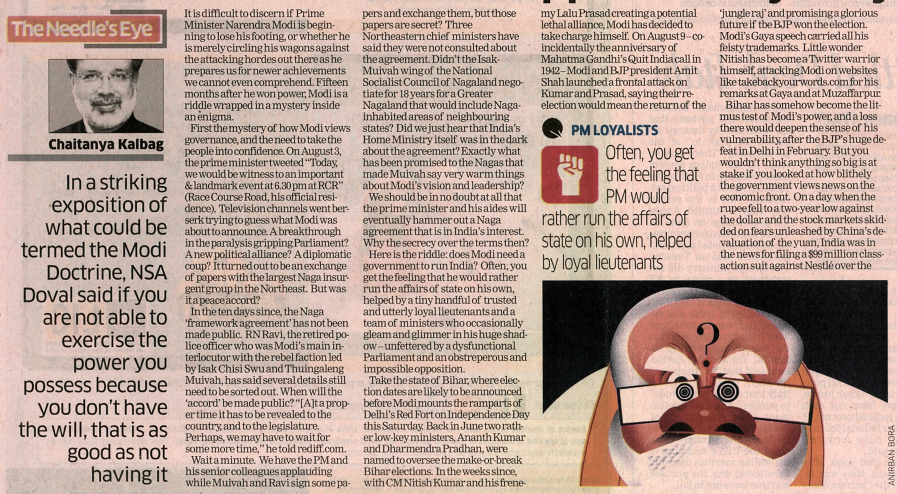 First the mystery of how Modi views governance, and the need to take the people into confidence. On August 3, the prime minister tweeted ‘‘Today we would be witness to an important & landmark event at 6.30 pm at RCR” (Racecourse Road, his official residence). Television channels went berserk trying to guess what Modi was about to announce. A breakthrough in the paralysis gripping Parliament? A new political alliance? A diplomatic coup? It turned out to be an exchange of papers with the largest Naga insurgent group in the Northeast. But was it a peace accord?
