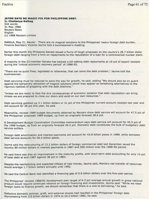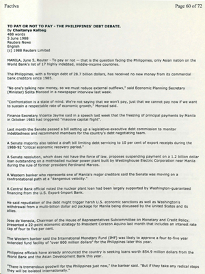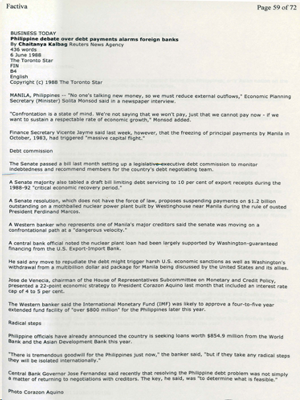 11 May 1988 Reuters News English (c) 1988 Reuters Limited MANILA, May 11, Reuter – The Philippine Senate has ended a six-month lull by taking some tough steps on the country’s debt. It has proposed limiting debt service limit and suspending payments on a 1.2 billion dollar nuclear plant loan. The Senate also unanimously passed…