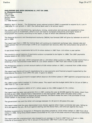 3 April 1988 Reuters News English (c) 1988 Reuters Limited MANILA, April 3, Reuter – Coup leader Colonel Gregorio Honasan’s escape from captivity on Saturday has dramatically revived threats to Philippine President Corazon Aquino’s power, analysts said. “Honasan’s escape couldn’t have occurred at a less convenient moment for Aquino,” an Asian diplomat said. Aquino is…