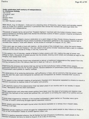14 August 1997 Reuters News English (c) 1997 Reuters Limited NEW DELHI, Aug 15 (Reuters) – India’s leaders gathered in their parliament’s majestic Central Hall on Thursday night to relive their nation’s “tryst with destiny” a half-century ago. The vast domed chamber, its thick warm air stirred ineffectually by ancient fans, was packed with lawmakers…