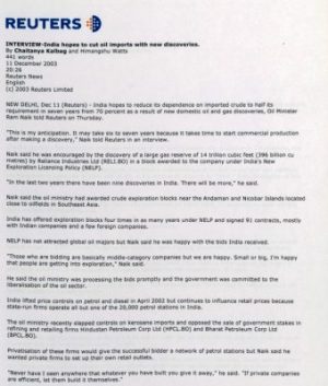 11 December 2003 Reuters News English (c) 2003 Reuters Limited   NEW DELHI, Dec 11 (Reuters) – India hopes to reduce its dependence on imported crude to half its requirement in seven years from 70 percent as a result of new domestic oil and gas discoveries, Oil Minister Ram Naik told Reuters on Thursday. “This…