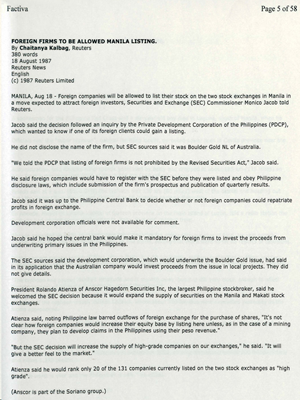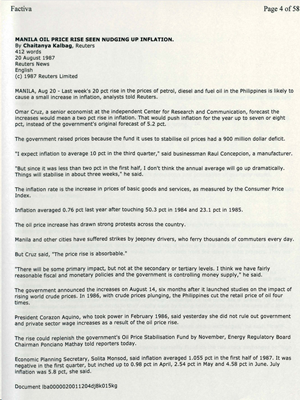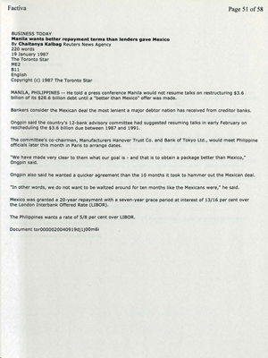 7 August 1987   Reuters News   English   (c) 1987 Reuters Limited   MANILA, Aug 7, Reuter – The growing call in the Philippines for a repudiation of some of the country’s 28.4 Billion dollar foreign debt was strongly attacked today by the finance minister and the leader of an influential business group.  Finance Secretary Jaime Ongpin told reporters…