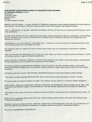 25 August 1987  Reuters News  English  (c) 1987 Reuters Limited  MANILA, Aug 25, Reuter – A major coalition of Philippine landowners today labelled President Corazon Aquino’s land reforms “communistic” and said violence might erupt if the program was pushed through.  “This is a polarisation of classes,” Eduardo Hernandez, chairman of the Council of Agricultural Producers,…