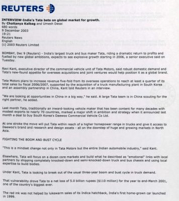 9 December 2003 Reuters News English (c) 2003 Reuters Limited BOMBAY, Dec 9 (Reuters) – India’s largest truck and bus maker Tata, riding a dramatic return to profits and fuelled by new global ambitions, expects to see explosive growth starting in 2006, a senior executive said on Tuesday. Ravi Kant, executive director of the commercial…