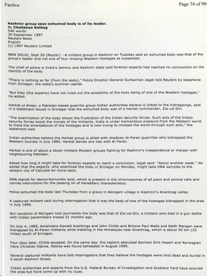 30 September 1997 Reuters News English (c) 1997 Reuters Limited NEW DELHI, Sept 30 (Reuters) – A militant group in Kashmir on Tuesday said an exhumed body was that of the group’s leader and not one of four missing Western hostages as suspected. The chief of police in India’s Jammu and Kashmir state said forensic…