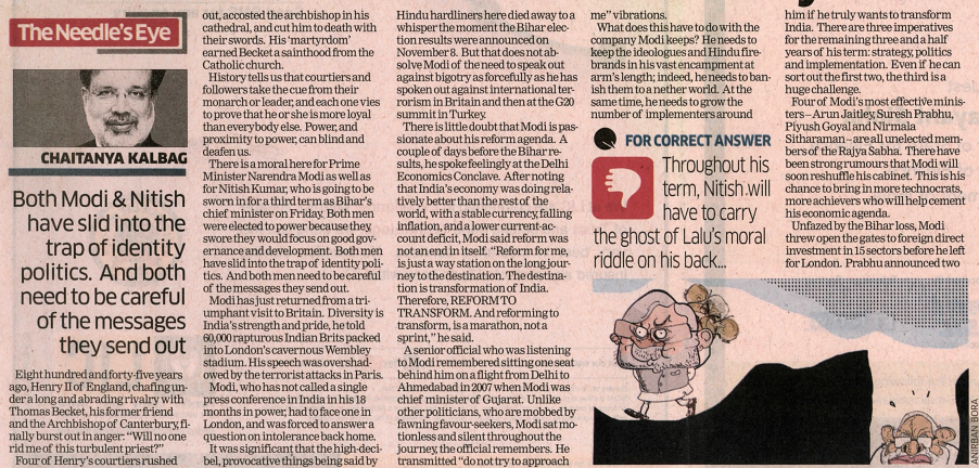 There is a moral here for Prime Minister Narendra Modi as well as for Nitish Kumar, who is going to be sworn in for a third term as Bihar’s chief minister on Friday. Both men were elected to power because they swore they would focus on good governance and development. Both men have slid into the trap of identity politics. And both men need to be careful of the messages they send out.
